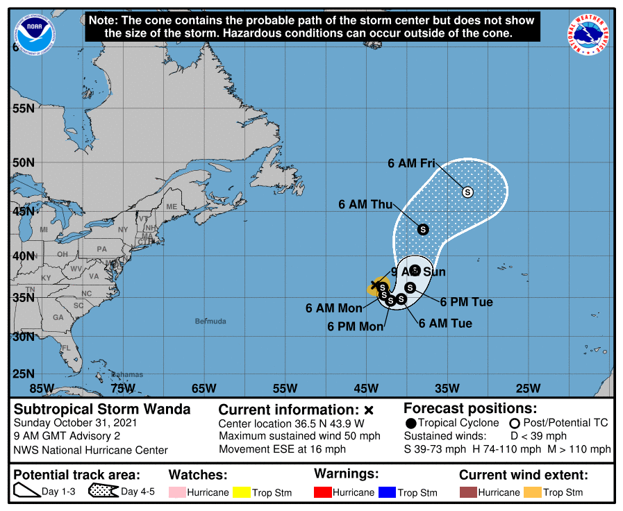 Boo! That is Sub-Tropical Storm Wanda that formed last night over the northern Atlantic Ocean. No land concerns but that does complete our list of 2021 tropical names for the Atlantic. If there is another named system the alternate list will be used with Adria being next up.
