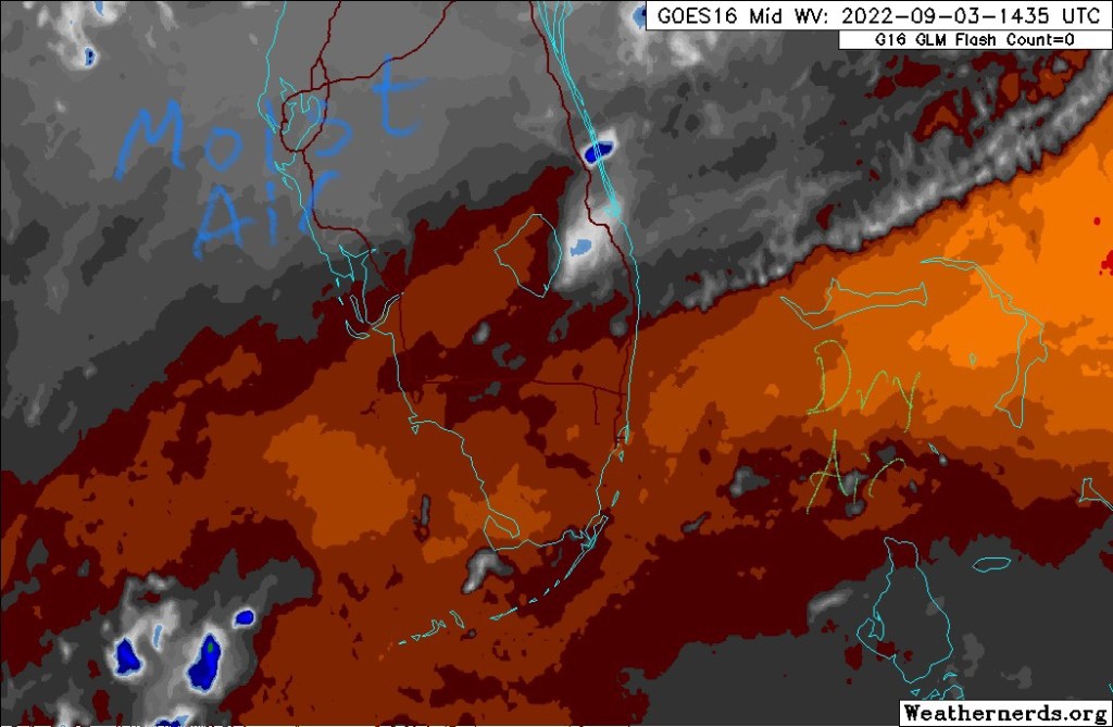 We have had some drier air work into the area overnight and this will help keep our rain chances down through the Labor Day weekend. Showers and a few thunderstorms are possible but not to the extent we have seen over the past week. The dry air can be see on water vapor imagery (in brown on this image).