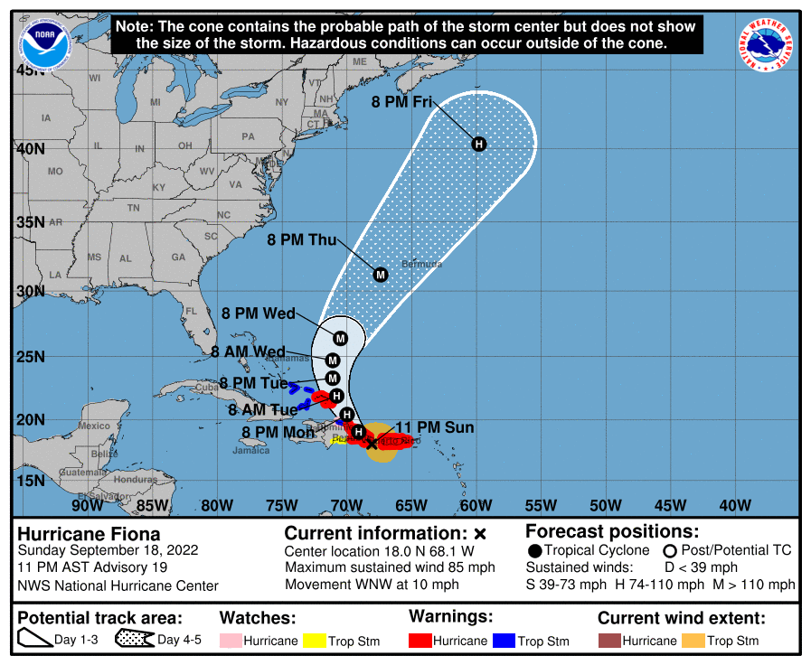 Hurricane Fiona caused major flooding in Puerto Rico today, and reports state that the entire island is currently without power. Fiona is will not directly impact the US, but it will help bring us a nice breeze Wednesday through Thursday. The latest models are in excellent agreement and the latest NHC forecast as of 11pm is below as well.