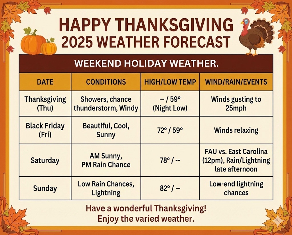 Saturday morning will not be as cool, with rain chances remaining near zero until the afternoon. It looks like a great day for the last FAU football game of the season, kicking off at 12:00 PM on Saturday against East Carolina, with a high of 78°.