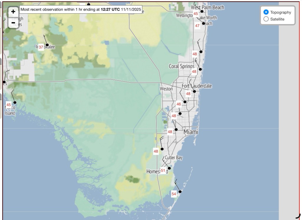 Saturday morning will not be as cool, with rain chances remaining near zero until the afternoon. It looks like a great day for the last FAU football game of the season, kicking off at 12:00 PM on Saturday against East Carolina, with a high of 78°.