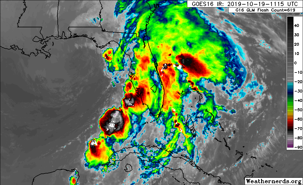 Infrared satellite shows an impressive area of cooler tops off the coast with lightning now being detected.